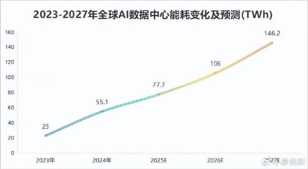 预计2025年,人工智能数据中心的IT能耗为77.7TWh,已经达到2023年能耗量的两倍。2027年有望提升至146.2TWh,仍保持着上升势头。