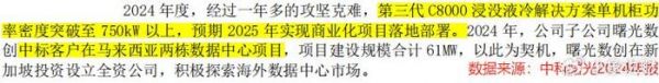 数据显示,2024年其冷板式液冷、浸没式液冷这两个业务,分别实现了1.58亿和0.49亿的营收。另外,年报中还显示,曙光数创中标马来西亚2栋数据中心项目,正逐步打开海外数据中心市场。