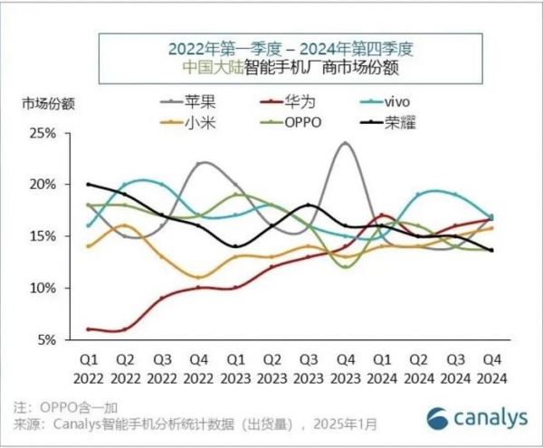 同一时期,华为带着mate 60强势回归,之后荣耀市场份额就一泻千里,华为则在2025年Q1,出货量恢复至全国第二(另一机构TechInsight数据为第一)。