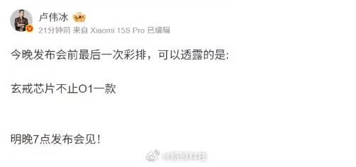 【#卢伟冰预告发布会##卢伟冰称玄戒芯片不止O1#】小米 15 周年战略新品发布会将于明晚举行,其中小米时隔多年公布的自研芯片玄戒 O1 成为关注重点。