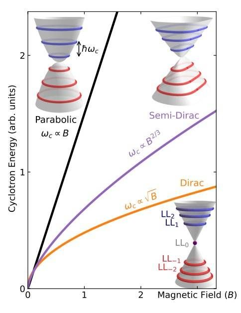 常规费米子(黑线)、狄拉克费米子(橙线)和半狄拉克费米子(紫线)的回旋能量与磁场的关系丨图片来源:Physical Review X