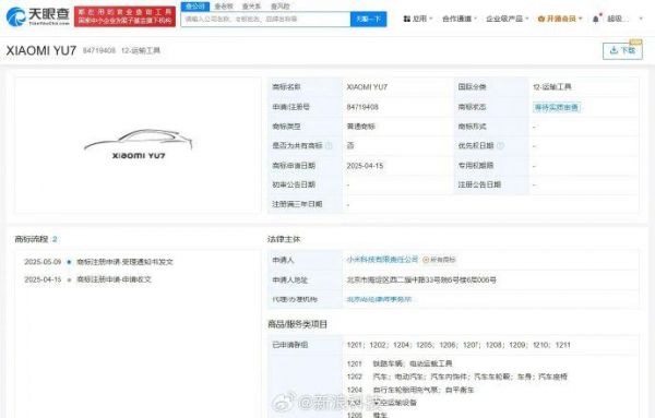 网址: 多个小米YU7商标已通过初审 http://www.xishuta.cn/newsview136414.html