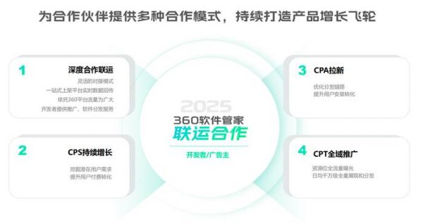 360软件管家面向开发者提供联运+CPT/CPA/CPS等多种合作模式,联运模式支持数据回传,开发者只需6步、最快1天即可完成联运上线,在获客外“留量”;CPT/CPA/CPS则可确保开发者获得真实活跃和付费用户,只需要为效果买单,减少了推广资源的浪费。
