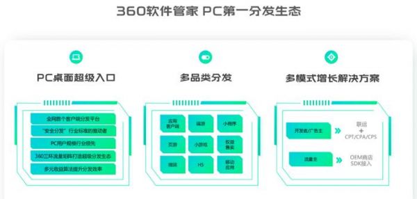 经过20年在PC端的深耕,360软件管家已覆盖超4亿用户,月活用户过亿。除了支持客户端软件的分发外,360软件管家还支持端游、页游、小程序、小游戏甚至移动App等全品类的应用分发,事实上已成为PC端的超级分发入口。