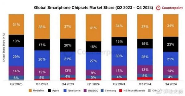 高通(Qualcomm)和苹果(Apple),市占率均在20%左右。高通的芯片产品广泛应用于各大手机品牌的中高端旗舰机型中,其强大的性能和卓越的图形处理能力备受消费者青睐;苹果自研的A系列芯片一直是行业内的标杆,其芯片的优势在于其与iOS系统的深度融合,能够为用户带来流畅、稳定的用户体验。
