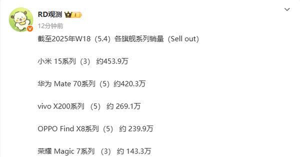 【CNMO科技消息】近日,CNMO注意到,有数码博主曝光了截止2025年第18周,即5月4日中国五大主流手机厂商的旗舰机型销量数据: