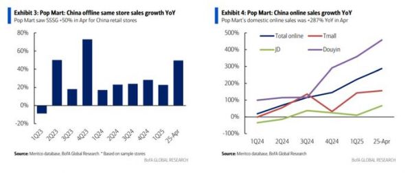 根据Meritco数据库,4月份泡泡玛特通过在线电商平台(包括天猫、京东、抖音)的销售同比增长287%,较2025年第一季度(+223%)加速,其中天猫/京东/抖音分别增长156%/66%/457%。国内线下同店销售增长明显加速,增长50%(相比2025年第一季度+23%)。