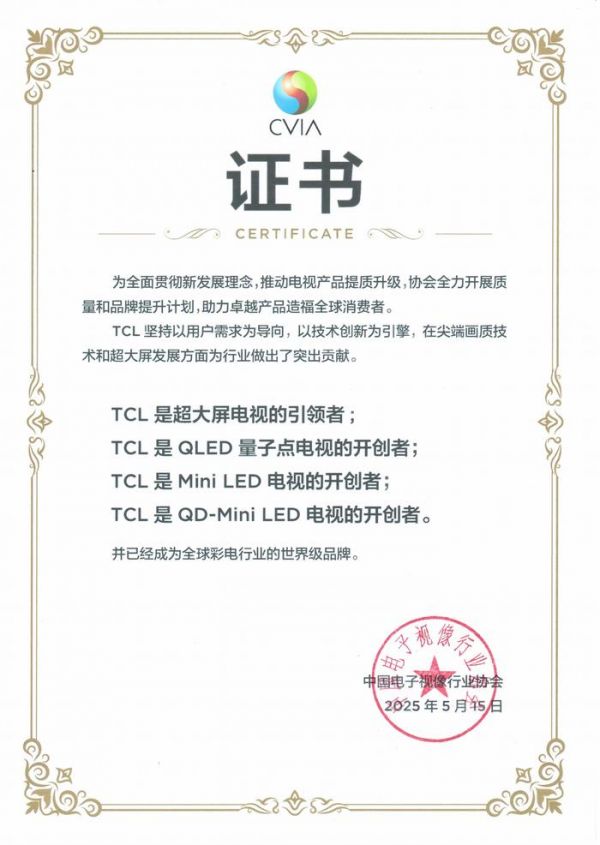 中国电子视像行业协会的认证代表行业最权威、最具代表性的肯定,代表了对TCL技术能力的高度认可,更彰显其作为全球电视产业关键驱动力的硬核实力,也正是TCL四十余年来坚持以技术为核心、以用户为中心所积淀出的系统性竞争力的集中体现。