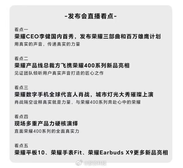 #荣耀CEO李健国内首秀#【#荣耀发布会定档5月28日#,将发布荣耀三部曲和百万雄鹰计划】荣耀 400 系列手机发布会已定档 5 月 28 日 19:30,预计届时将带来荣耀 400 标准版和 Pro 两款新机,以及 WATCH Fit 手表、荣耀平板 10 等新品。