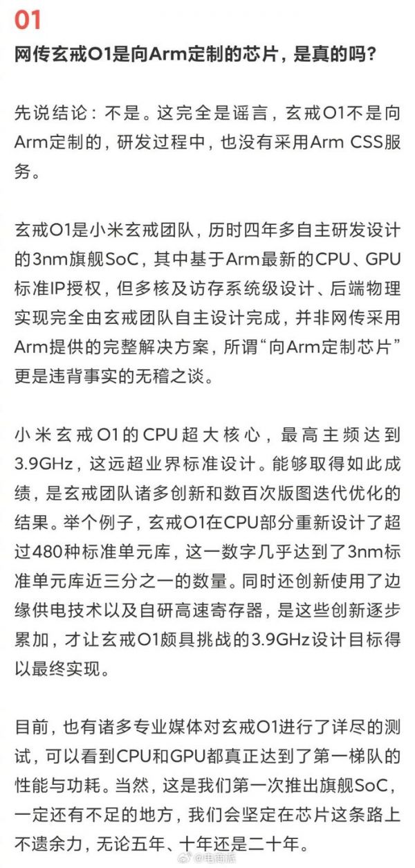小米玄戒负责人回应设计方案:玄戒O1并非基于Arm CSS软核或硬核方案