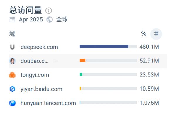 根据similarweb的数据,2025年4月,混元的访问量只有107万,远低于Deepseek的4.8亿、豆包的5291万、阿里通义的2353万、文心一言的1059万。