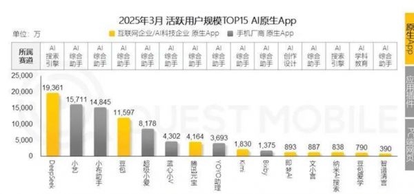 Questmobile发布了一份中国AI应用报告,分门别类地对比了中国市场上各类AI应用的表现(所有数据都是2025年3月的),我们一起来看看。