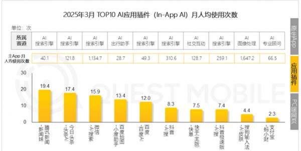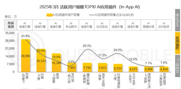 接着看AI插件应用:微信-AI搜索的表现排第三。2025年3月,AI应用插件排名第一为百度-AI搜索,用户规模达2.91亿,占主App的41.9%;排第二的是抖音-AI搜,用户规模为2.03亿,占比达23.0%;微信-AI搜索的月活用户为1.63亿,占主APP的比例为14.9%;