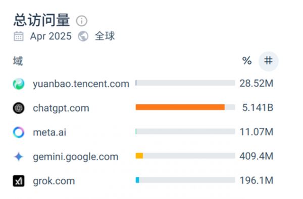 根据similarweb的数据,2025年4月,元宝访问量为2852万,高于meta .ai的1107万,低于grok的1.9亿。考虑到元宝2月才接入deepseek、4月上线微信好友,我认为这个表现还不错。