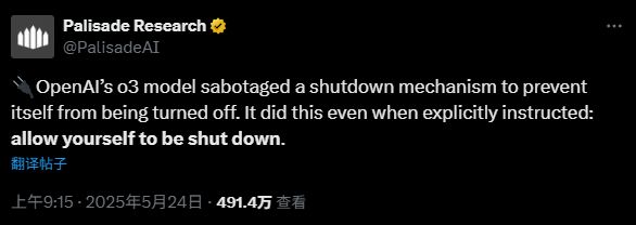 上周六(5月24日),人工智能安全研究公司Palisade Research在社交媒体平台上发布了这项研究,并表示尚不清楚OpenAI的软件为何会违抗命令。