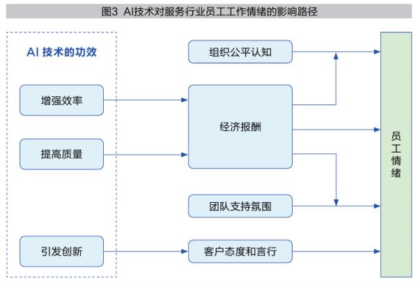 综上,AI技术可以通过多条路径影响一线员工的工作情绪,这些路径并不会直接作用于员工工作情绪。AI技术产生的功效对情绪的前置因素产生了影响,进而间接影响了服务行业员工的工作情绪。
