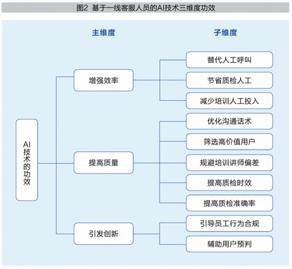 为了探索AI技术对电话催收一线人员工作的影响,本文基于对X公司员工的访谈,发现了三个主维度功效:增强效率、提高质量和引发创新(见图2)。通过访谈者的口述原文能够让我们感受到应用AI技术在这三个主维度上给该行业一线员工带来的多重功效。