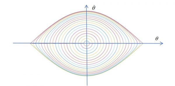 图2由θ(位形空间)和(速度空间,在本文设定的条件下,即m=1kg,l=1m,且加入动量量纲时,也表示动量空间)构成的相空间。图中封闭的彩色曲线是单摆在某一能量值下在相空间的运动轨迹。