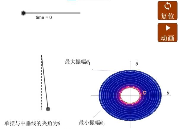 整个单摆的运动,可以用角度θ来描述,θ就是广义坐标。而广义动量,按照分析力学的定义,是体系动能对广义速度的偏导,为。为了后面运算方便,我们取m=1kg,l=1m,这样,在单摆的例子中,忽略量纲,动量可以用代替。