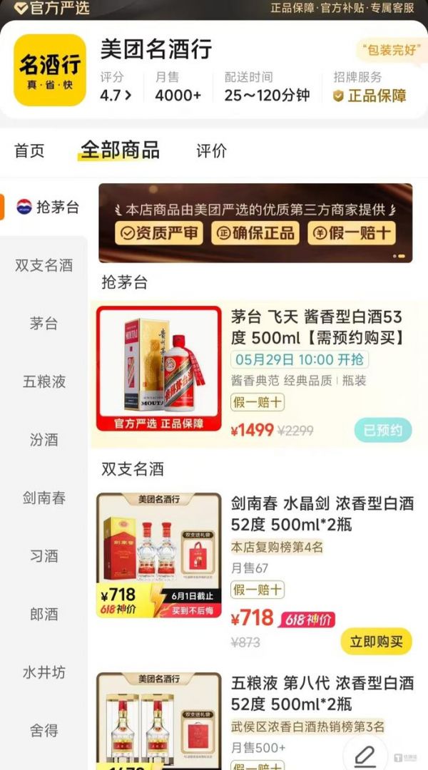 美团闪购酒水区用“原价抢茅台”为噱头,吸引了不少关注度。其“618”产品大都标注了“618神价”“截止6月1日”“买到不后悔”等字眼,价格上也似乎更有优势,比如第八代普五2瓶只要1678元。