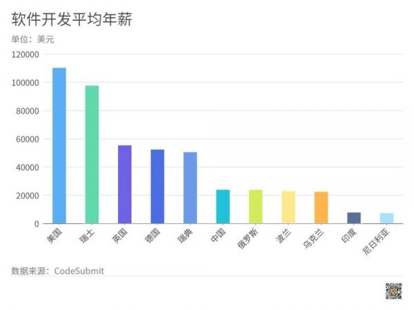 印度程序员的工资也很低,印度软件开发者的年薪只相当于美国同行的7%,中国同行的32%。