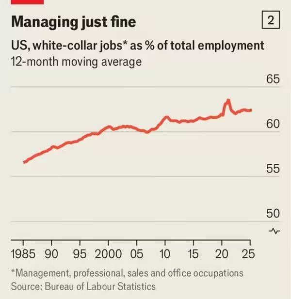 更广泛的就业数据显示,即便在那些被认为最易受AI影响的白领岗位(如办公室文员、财务操作、销售支持等),也未出现因AI应用而导致岗位显著减少的迹象。事实上,过去一年,美国白领职业的就业占比甚至略有上升。