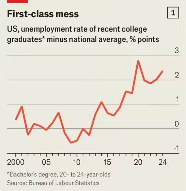 然而,数据显示,应届毕业生相对整体失业率的上升趋势,早在生成式AI兴起之前的2009年便已开始。并且,他们当前的实际失业率(约4%)仍处于历史较低水平。若将此归咎于AI,显然缺乏足够依据。