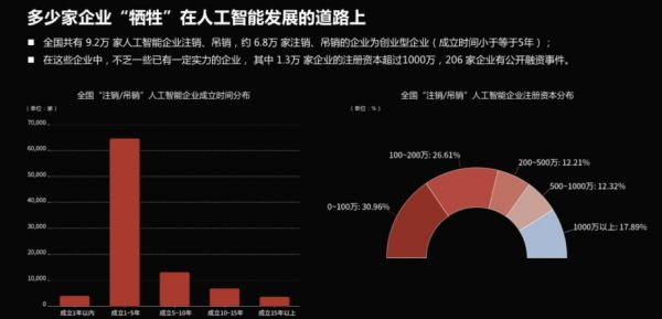 不过,在行业飞速发展的同时,也有不少企业“牺牲”在人工智能发展的道路上。截至目前,全国共有9.2万家人工智能企业注销、吊销。其中约6.8万家注销、吊销的企业为创业型企业(成立时间小于等于5年)。