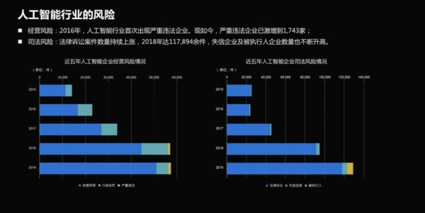 当一个产业进入良性、健康发展阶段,自然会有越来越多的优胜劣汰。从人工智能行业的经营风险和司法风险来看,2016年人工智能行业首次出现严重违法企业,现如今,严重违法企业已激增到1743家。在司法风险方面,法律诉讼案件数量持续上涨,2018年达117894件,失信企业及被执行人企业数量也不断升高。(本文首发钛媒体,作者/高梦阳)