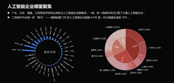 从行业分布来看,一线、新一线城市汇聚了大量人工智能企业,广东、北京等经济发达地区是人工智能企业的聚集地。