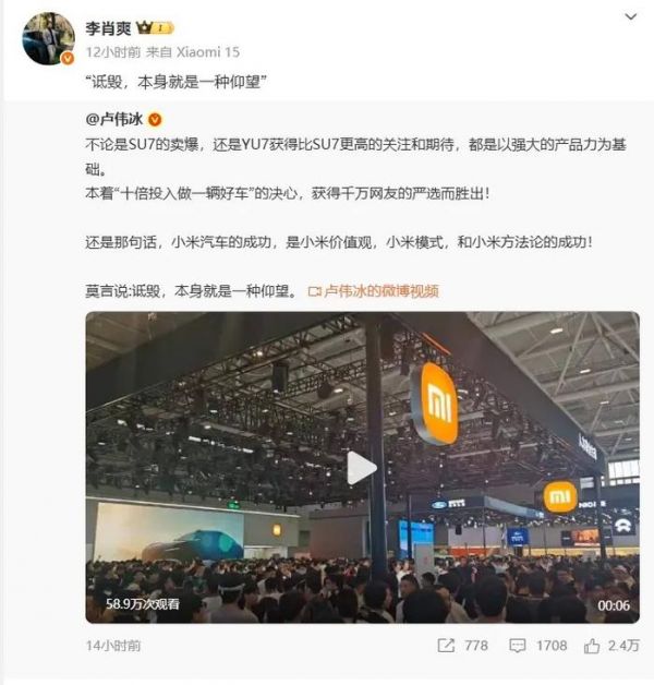 稍后在5月31日晚间,小米集团总裁@卢伟冰 发文:不论是SU7的卖爆,还是YU7获得比SU7更高的关注和期待,都是以强大的产品力为基础。