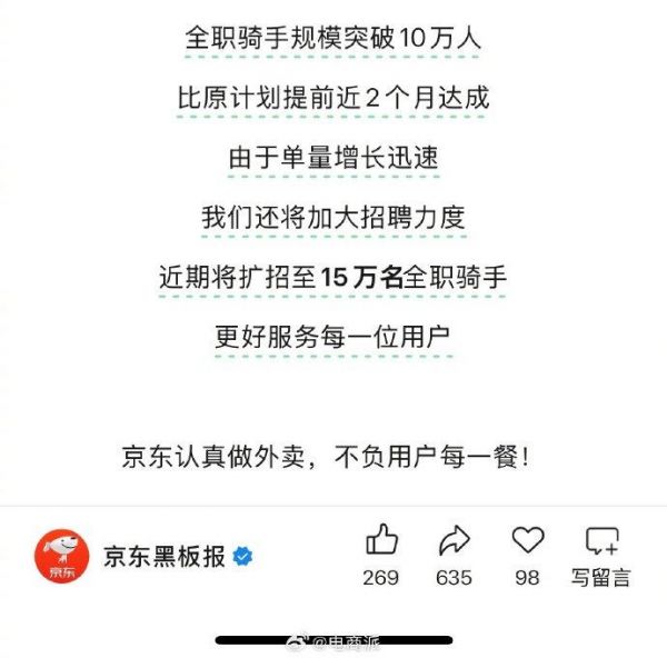 京东外卖日订单破2500万,全职骑手将扩招至15万。
