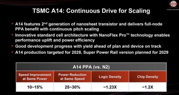 台积电透露,新节点将采用其第二代环栅(GAA)纳米片晶体管,并将通过NanoFlex Pro技术提供更大的灵活性。台积电预计A14将于2028年投入量产,但不支持背面供电。据介绍,A14是台积电全节点的下一代先进硅技术。从速度来看,与N2相比,其速度提高了15%,功耗降低了30%,逻辑密度是整体芯片密度的1.23倍,或者至少是混合设计的1.2倍。