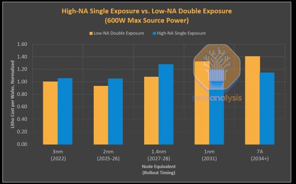 “其背后的原因很简单,就是剂量需求(dose requirements)的快速增长,但进一步提高剂量与关键尺寸(CD)曲线的指数级增长对产量的损害非常大,以至于尽管关键尺寸缩小,低数值孔径双重曝光的成本优势在2nm和1.4nm节点之间仍然有所提升。”semianalysis强调。