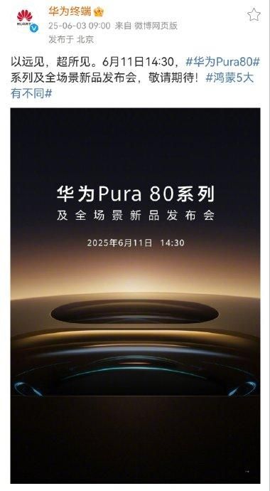 华为今日官方宣布将于6月11日14:30举行华为Pura 80系列及全场景新品发布会