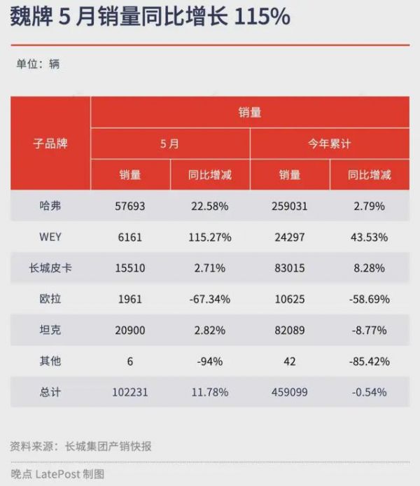今年 5 月,长城累计卖出 10.2 万辆新车,同比增长 11.8%。具体到各品牌,其中主力品牌哈弗与坦克销量分别为 5.8 万辆和 2.1 万辆,除欧拉外所有品牌均同比增长,尤其是魏牌。