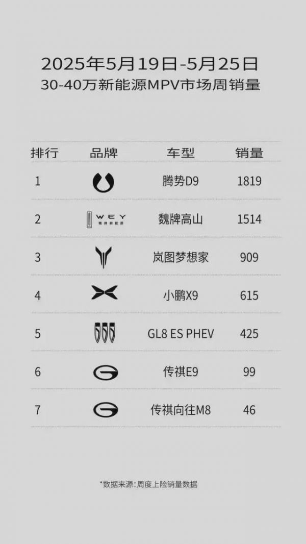 据官方数据,新款高山上市 24 小时内锁单超过 5900 辆,超过前代全年销量。第三方上险数据显示,上市后首个完整周(5 月第三周),高山系列销量达 1514 辆,在 30 万至 40 万元新能源 MPV 中排名第二,仅次于腾势 D9。