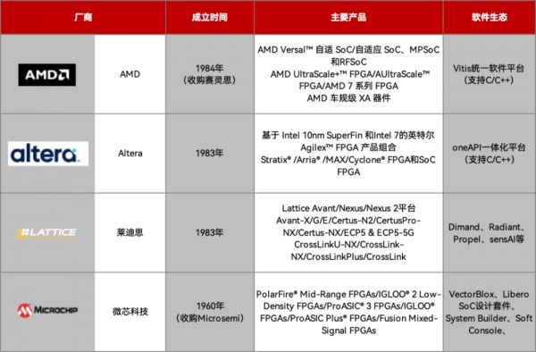 经过几十年的寡头垄断和行业整合,目前全球FPGA市场方面,AMD、Altera、莱迪思(Lattice)、微芯科技(Microchip)成为国际四雄,瓜分全球将近70%~80%的市场份额。