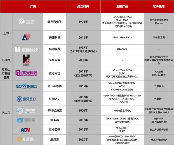 目前国内与FPGA相关研发企业数量超过28家,其中已在A股上市的企业包括复旦微电子、安路科技、航锦科技,成都华微电子上市“已问询”,紫光同创在日前启动上市辅导备案,云半导体、京微齐力、中科亿海微、智多晶、遨格芯微、易灵思则一直被加注。