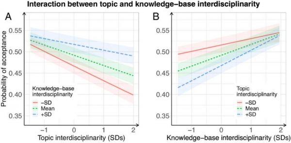那如果一项研究,从主题和知识库上来看,都是跨学科的,这时这项研究能否有更高的几率发表?答案是,当主题高度跨学科且知识库同样高度跨学科时,主题带来的负面影响显著减弱(图2A);而知识库不够多元,仅靠主题跨学科反而会加剧负面评价(图2B)。