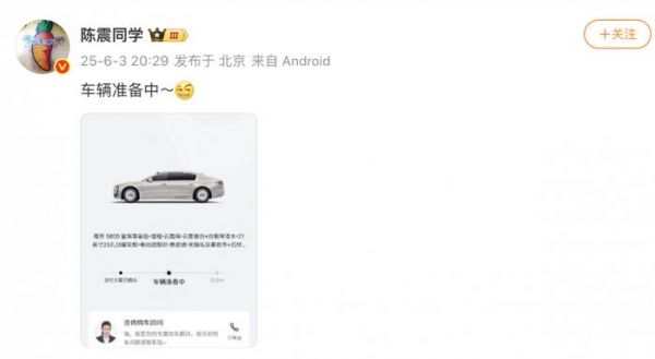 上市以来,已有不少人试驾过尊界S800。车评界知名人士陈震试驾之后称,这车约等于劳斯莱斯闪灵。从他最新晒图来看,他已经选购了尊界S800(星辉尊享版),目前车辆已经在准备中。