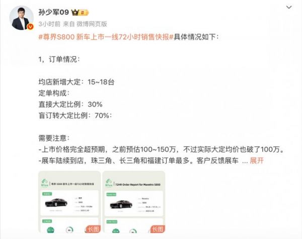 据车fans统计,尊界S800展车陆续到店,珠三角、长三角和福建订单最多,盲订客户进店基本转化。具体用户画像上,私营企业老板,传统行业居多,华为手机用户。
