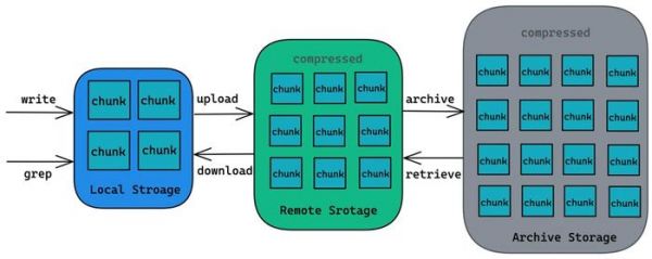 检索系统会在本地磁盘创建日志块并写入日志数据, 数据会在本地存储(本地 SSD 磁盘)中保留一定时间 (一般是几个小时左右), 等超过时间后日志块会被压缩并上传至远程存储中 (对象存储中的标准存储类型), 再经过一段时间后日志块会沉降到归档存储中 (对象存储中的归档存储类型)。