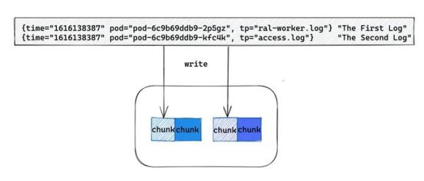 总的来说, 检索系统会将一个容器产生的同一类日志按时间顺序写入到一个文件中, 并按时间维度拆分, 保证一个块文件的大小在 100MB 以内,方便后续的传输和检索。