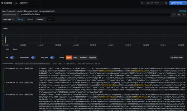 在检索体验上,检索系统适配了 Grafana 的日志检索入口,用户可以在 Grafana 上同时查看监控和检索日志,同时在检索上做了追踪体系的打通,通过日志详情的链接可以快速跳转到追踪系统中。