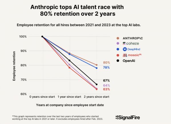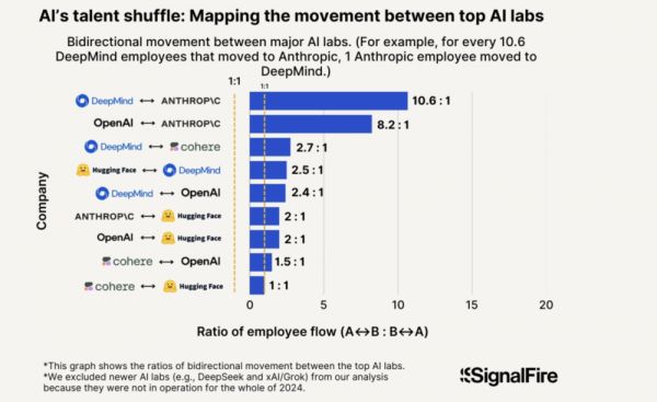 SignalFire透露,Anthropic在从这些公司挖走资深研究员和工程师方面,成效尤为显著。