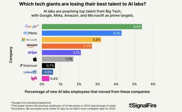 谷歌、Meta、微软、亚马逊主要目标,从这些公司跳槽到新兴AI实验室的员工占比分别为5.4%、4.3%、3.2%、2.7%。