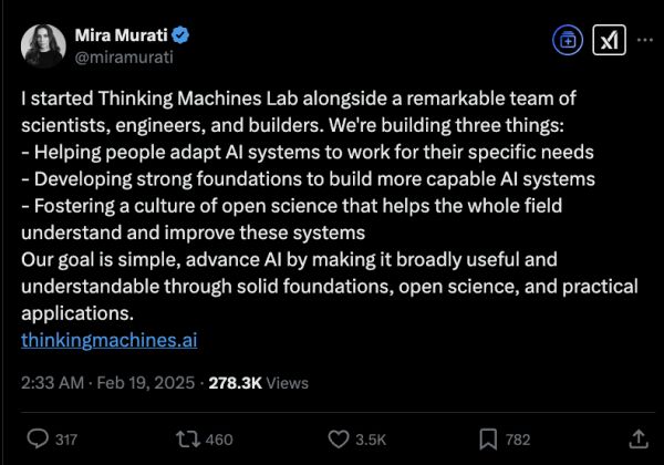 比如OpenAI前CTO Mira Murati在离职OpenAI后创办了新公司——Thinking Machines Lab,前段时间被曝正在筹集新融资,光种子轮就达到了20亿美元。