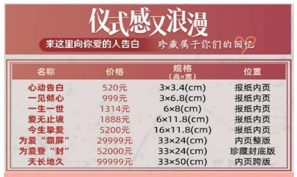 在价格方面,结婚登报报价根据版面大小呈现出梯度差异。例如《宁波晚报》内页3×3.4cm 小尺寸版面价格为520元,整版尤其是封底整版以及跨版价格相对高昂,最高达到99999元,整体价格区间跨度较大。