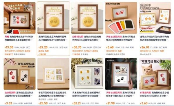 在宠物纪念消费市场的激烈竞争中,宠物爪印相框凭借其独特的成本效益与情感价值优势,成功突围并形成显著的市场竞争力。惊蛰研究所在电商平台上看到,宠物爪印相框的价格基本不会超过百元,相较于纹身、毛毡等技术门槛高、制作成本大的纪念方式,宠物爪印相框以亲民的价格定位和便捷的制作工艺,实现了对大众消费市场的有效渗透。